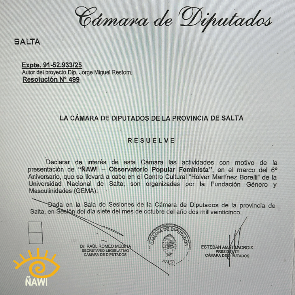 Éste reconocimiento, fué otorgado el 7 de octubre de 2025 mediante la Resolución N° 499; nos llena de orgullo y compromiso para seguir construyendo este espacio de resistencia, investigación y acción feminista desde Salta. Agradecemos profundamente al diputado Jorge Miguel Restom por impulsar esta declaración, y a las organizaciones hermanas que caminan junto a nosotras, tejiendo redes, sosteniendo luchas y sembrando esperanza colectiva: