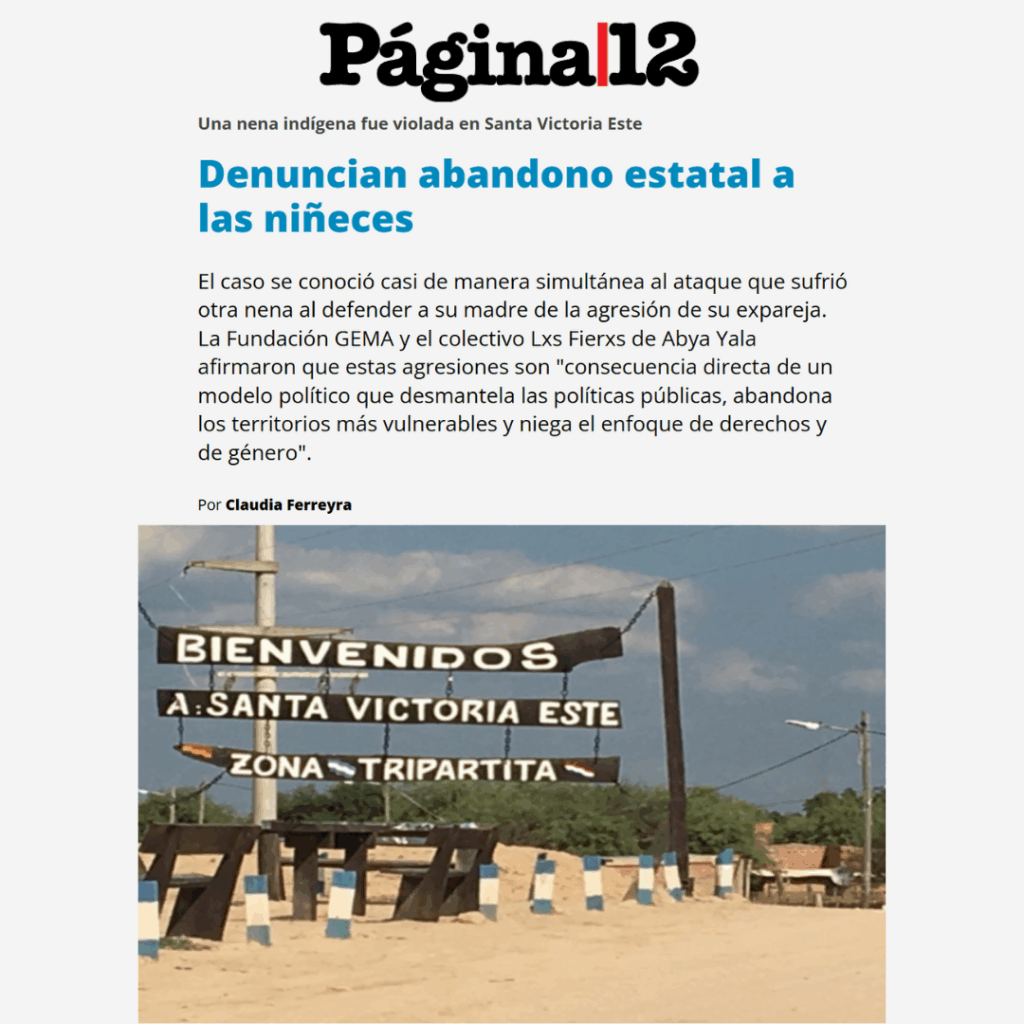 Tras el intento de femicidio de una niña que fue apuñalada al interponerse para defender a su madre en la localidad de Coronel Juan Solá (Estación Morillo, o Rivadavia Banda Norte), y la violación de otra niña perteneciente a la Comunidad indígena El Cruce, en en Santa Victoria Este, la Fundación GEMA junto al colectivo Lxs Fierxs